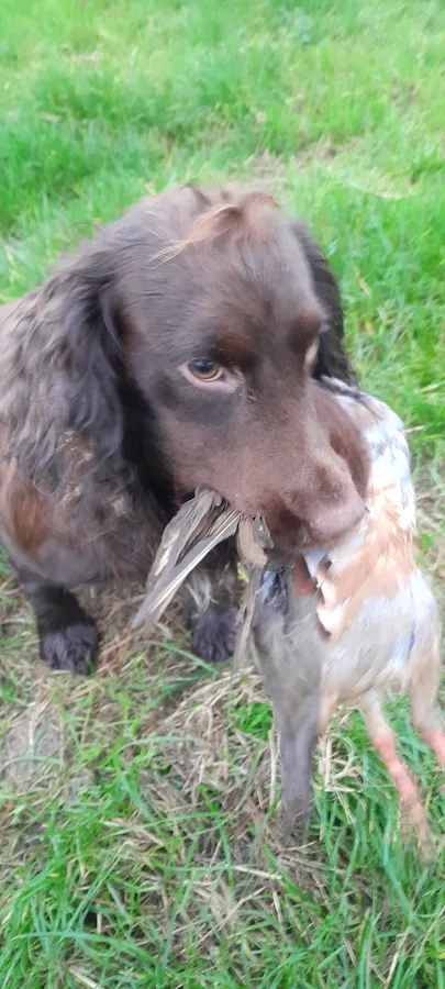 Tom has a very sweet biddable temperament. He is fast with a natural hunting pattern and he is fearless in cover. He is soft mouthed and a keen retriever from both land and water.