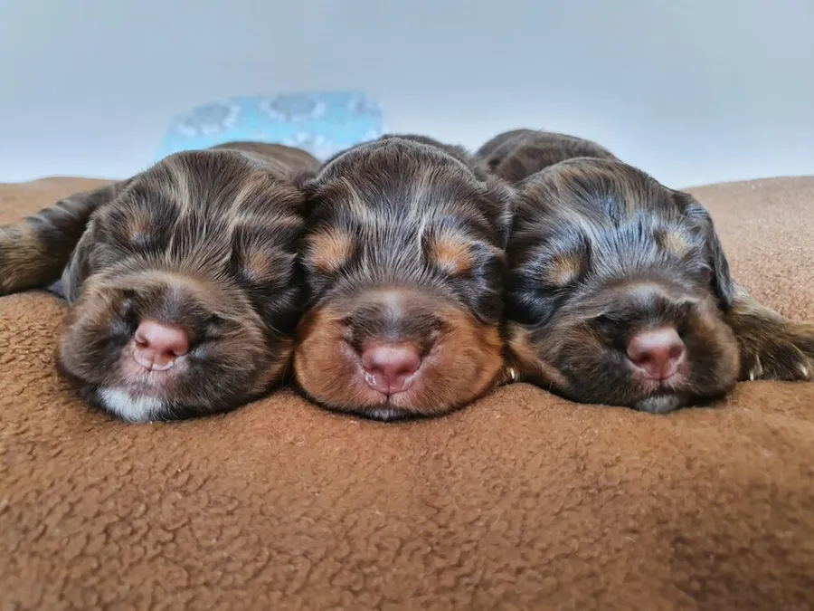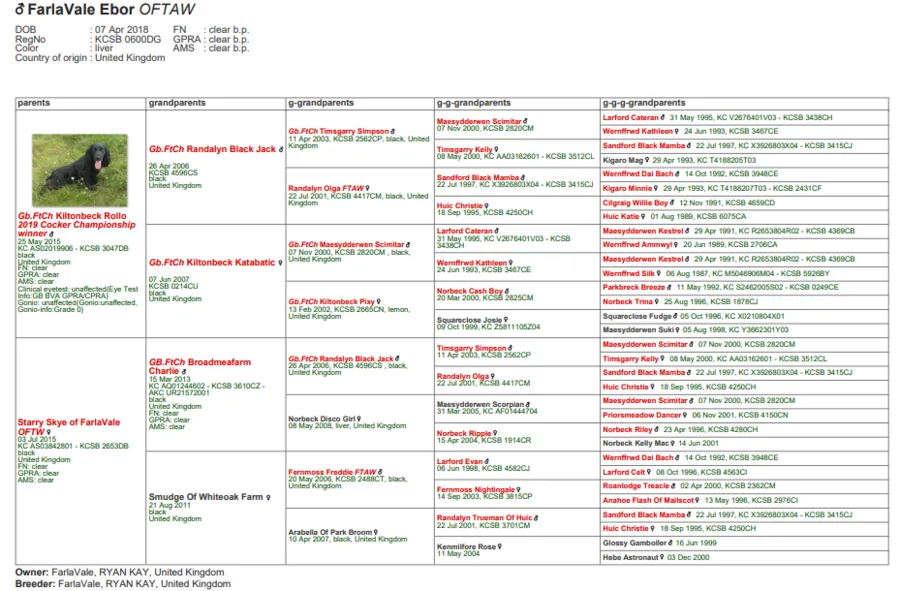 Farlavale Ebor (Sparky) is a powerful and compact working cocker with impeccable breeding. His dam is our own OFTW Starry Skye of FarlaVale and his sire is FTCH Kiltonbeck Rollo, winner of the 2019 Cocker Championships. Strong, fast and intelligent - his enthusiastic, biddable nature made him an easy dog to train and he is a fantastic beating and picking up dog. A top quality stud dog, he produces consistently outstanding pups. As a carrier of the ‘tan point’ gene he’s able to produce black & tan and liver & tan, see photos for an example of his tan-pointed offspring. He is health tested - hereditary clear of AMS, FN, prcd-PRA and PP. Sparky has numerous Field Trial awards including winning the Midland Counties Open Field Trial in December 2022 which qualified him for the Cocker Championships. His offspring are without exception, superb, and due to his honest and biddable disposition are suitable for either working, agility or pet homes. We ourselves have two young dogs by him who can each be seen, one of whom picked up a second place in his first ever field trial, has since won a Novice Trial and is now running at Open level himself. Sparky has also produced a number of offspring who are excelling in the field of agility, right through to Grade 7. For more info go to farlavale.co.uk.