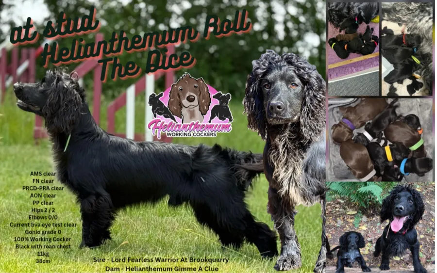 produced black and liver with white and roan patches and roan. Fully health tested working cocker. Dice is a lovely, friendly, and super smart dog. Trained in agility but has a family history of gundogs. Hes 5th generation Helianthemum. Current eye test and amazing hip and elbow scores.