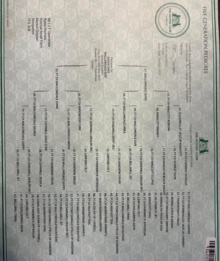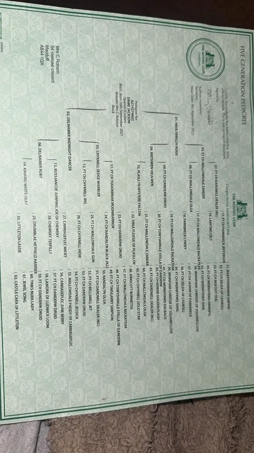 The mother is out of Heolybwlch Hogg (sire) X Delnamer Midnight Dancer (dam) and the father is out of Mallowdale Quad (sire) X FT CH Mallowdale Shine (dam).