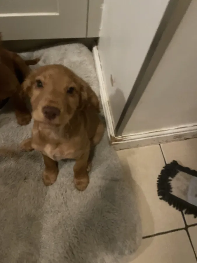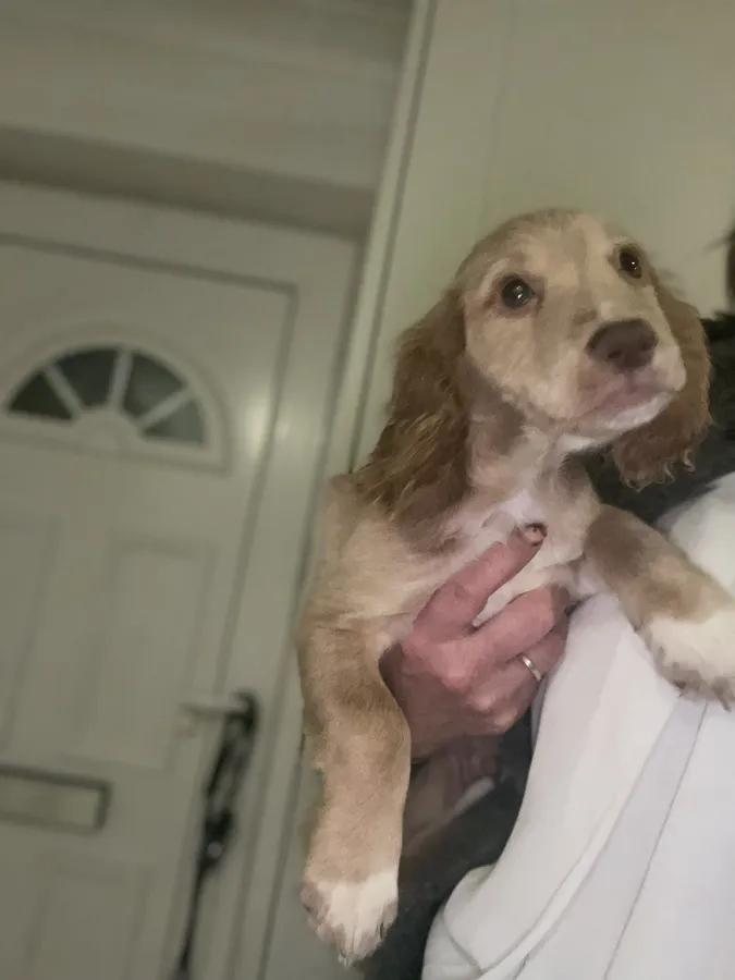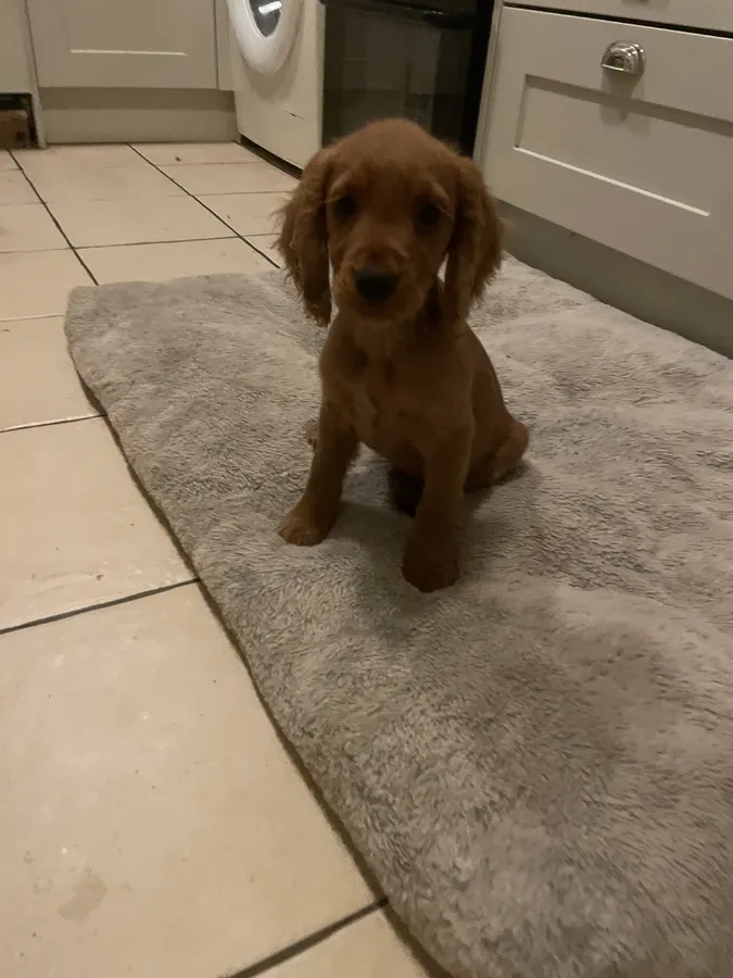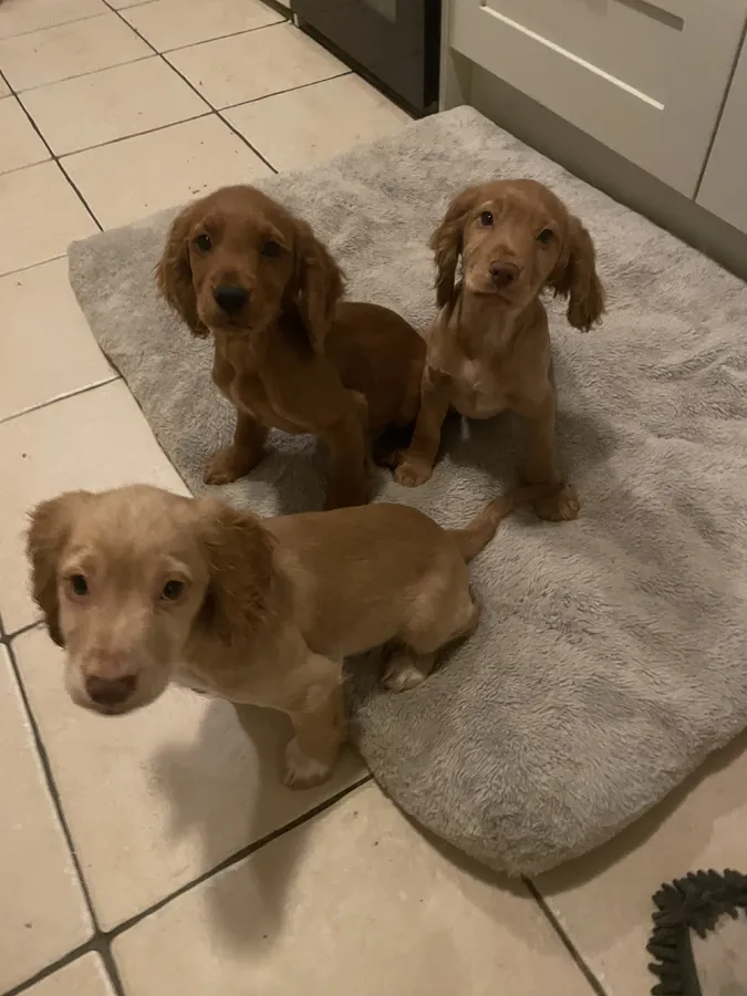 Golden and red working cocker spaniel puppies, born 15.08.25, 7x lovely, healthy, strong, confident, well socialised, with people and our other 3 dogs. Only 2 male dogs available now,(1 with docked tail, 1 with a full tail) 5 pups have found their new forever homes. Pups have be vet health checked, microchipped,legally docked and dew clawed, regularly wormed and flea treated and has had their first injection,now the boys are 12 weeks old they are create trained at night.