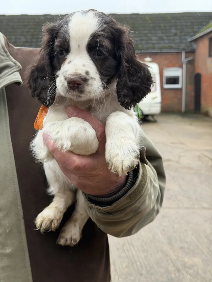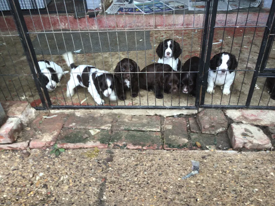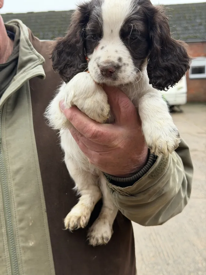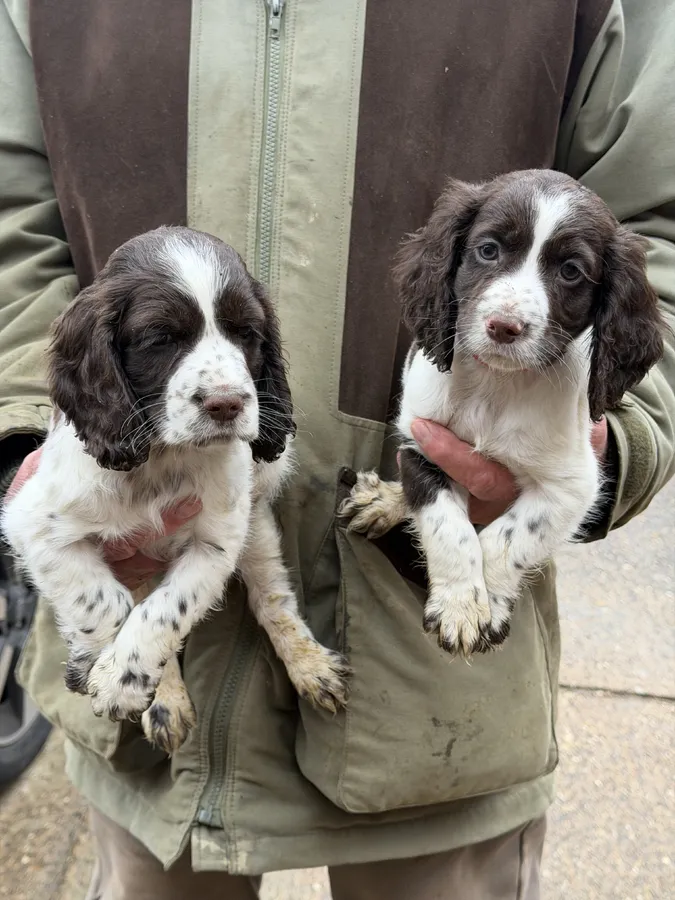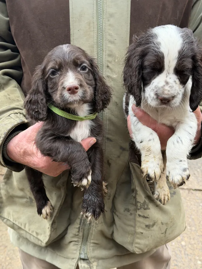 Beautiful litter of eight working cocker spaniel puppies. Three chocolate dog puppies. Three liver and white dog pups and one liver and white bitch. K.C. Registered. Legally docked and have had first inoculation. Microchiped. Will be ready to go to new homes on 3/12/25. Dog pups £1100. The liver and white bitch. £1250