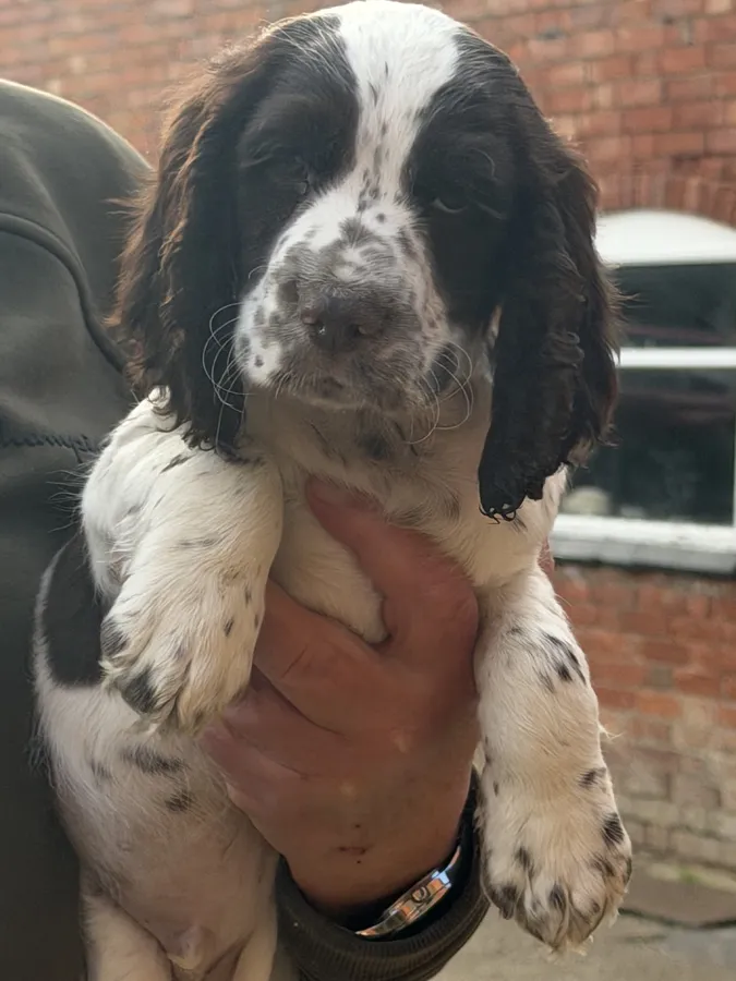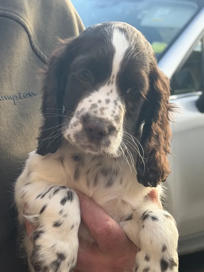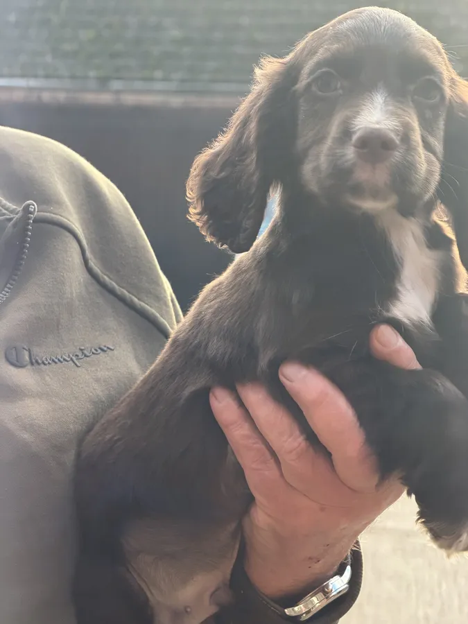 Just 3 boys left of this Beautiful litter of eight working cocker spaniel puppies.2 chocolate dog puppies and 2 liver and white dog puppies. £1100.00. K.C. Registered. Legally docked and have had first inoculation. Microchiped. Will be ready to go to new homes on 3/12/25.