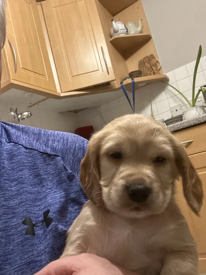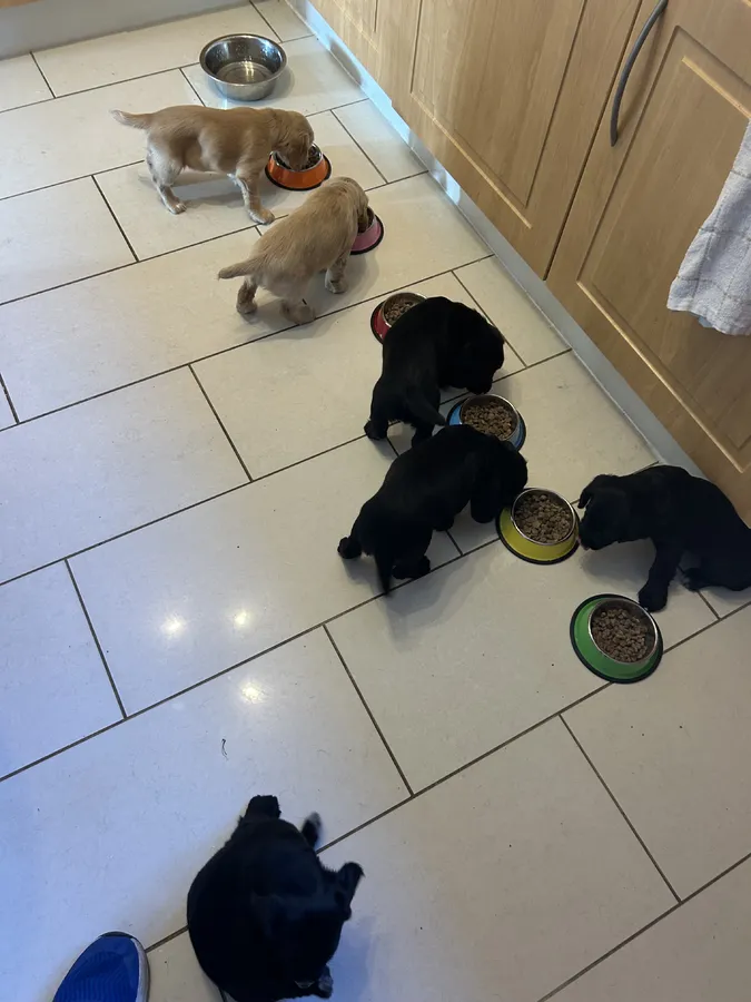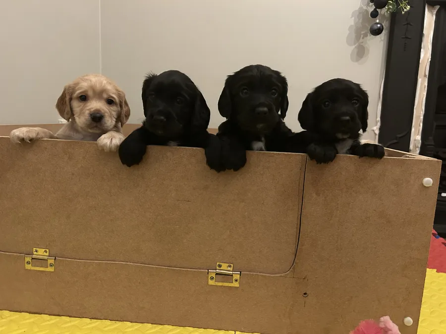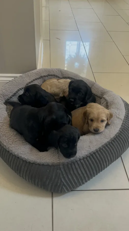1 black with white flash on chest and one golden. KC registered. Legally docked with appropriate certificates. Wormed up to date and will be chipped.