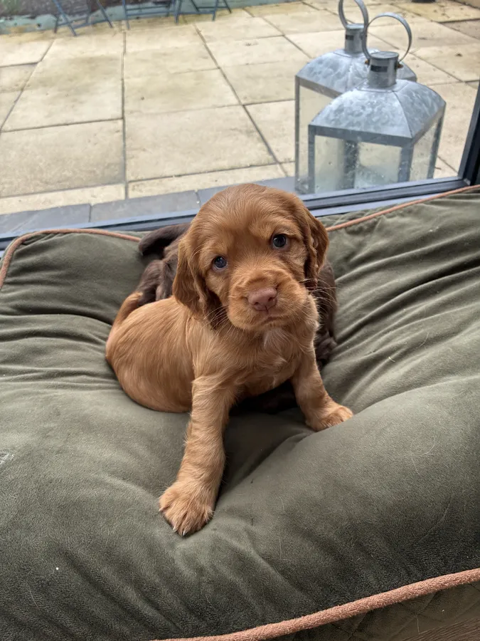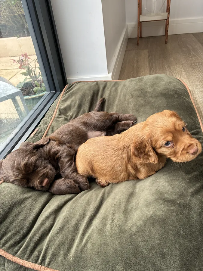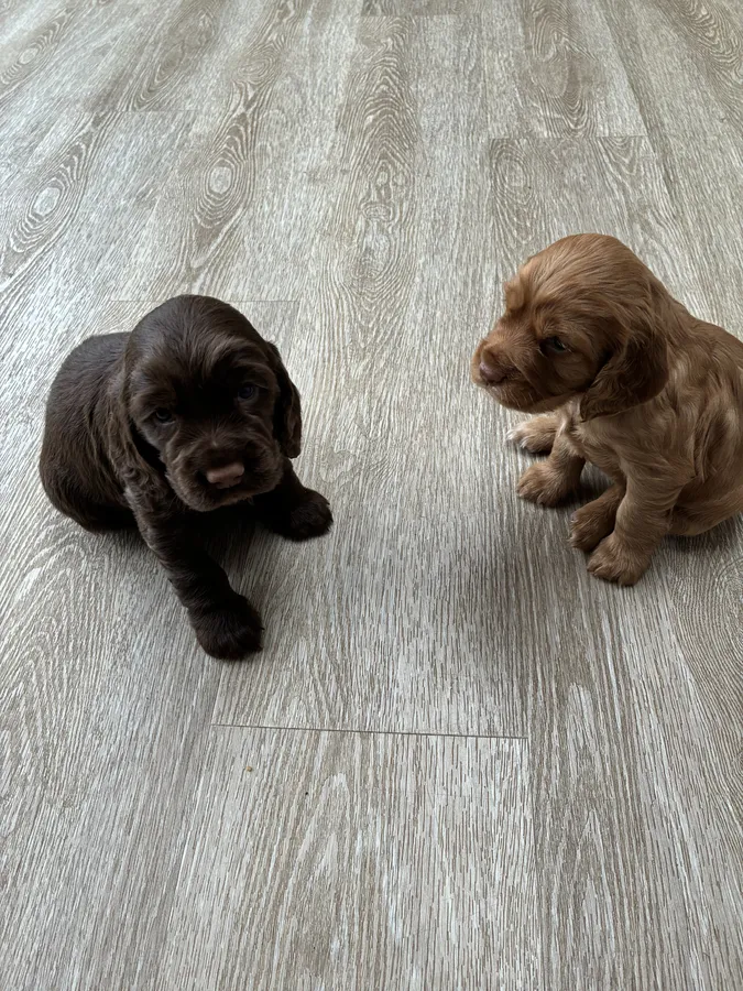 1 chocolate boy working cocker spaniel and 1 red bitch working cocker spaniel from our family dog (red working cocker spaniel).