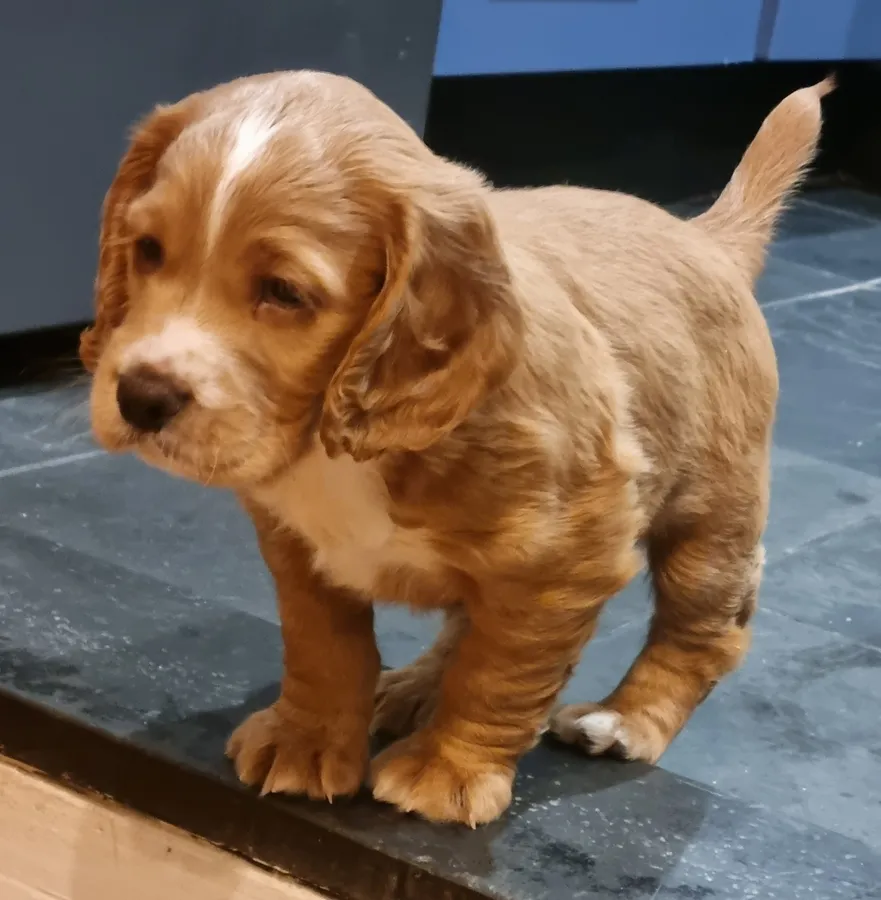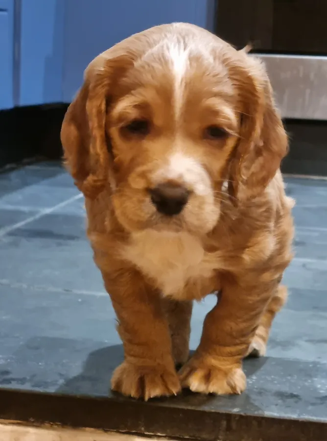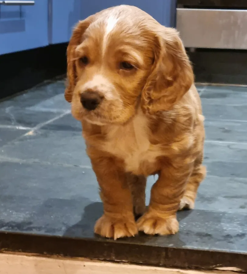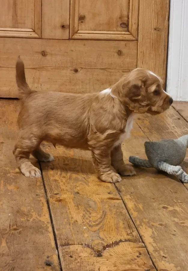 KC registered Working Cocker puppy for sale. Stunning Golden and white male.
