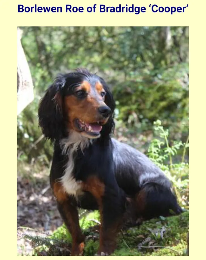 Sire: Cooper 'Borlewen Roe of Bradridge' is a lovely natured boy with natural working ability but not a “Crazy Cocker” with that all important off switch. He enjoys work, but is also is partial to an evening on the sofa watching TV. He is a fabulous companion, gets on well with our other dogs both male and female.