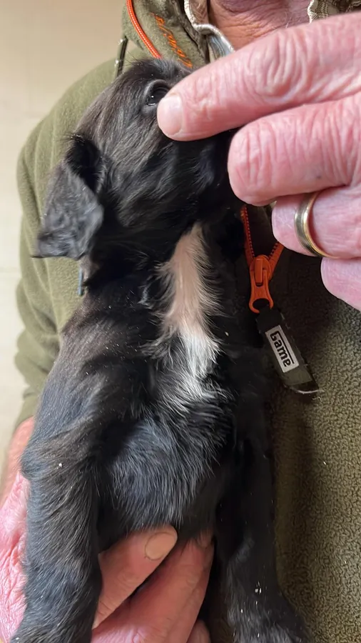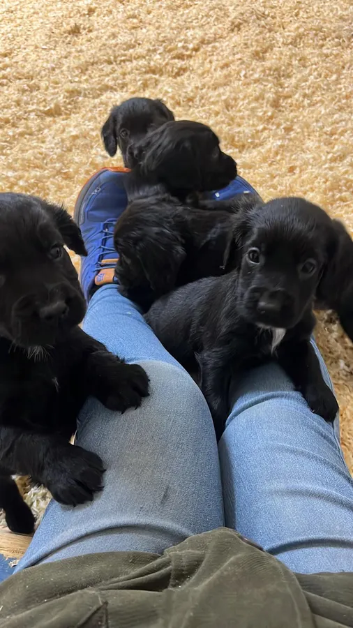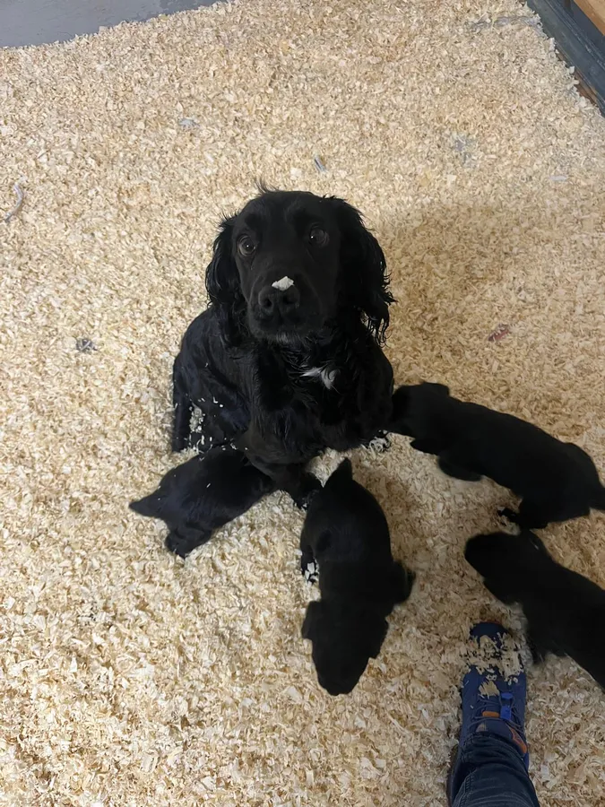 Litter of 5 black working cocker pups , 8 weeks old , 1 bitch pup still available both sire and dam here to be seen and strong working dogs in the shooting field , either peg dogs picking up or beating … microchipped wormed up to date and 1st vaccination , tails docked with certificate present