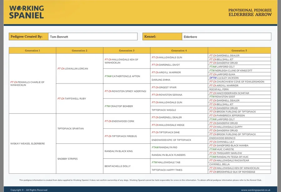 Brook is a quality biddable working dog who is keen to please, has been easy to train and is very willing to learn. She does around 40 days per season in the field. Her grandparents are FTCh Tiptopjack Firebug and FTCh Endowood Cork. Her pedigree is a mix of Tiptopjack lines and hard hunting/working dogs with a good share of FTCh’s too. The litter has a great pedigree including 49 FTCh/FTW/FTAW within it.