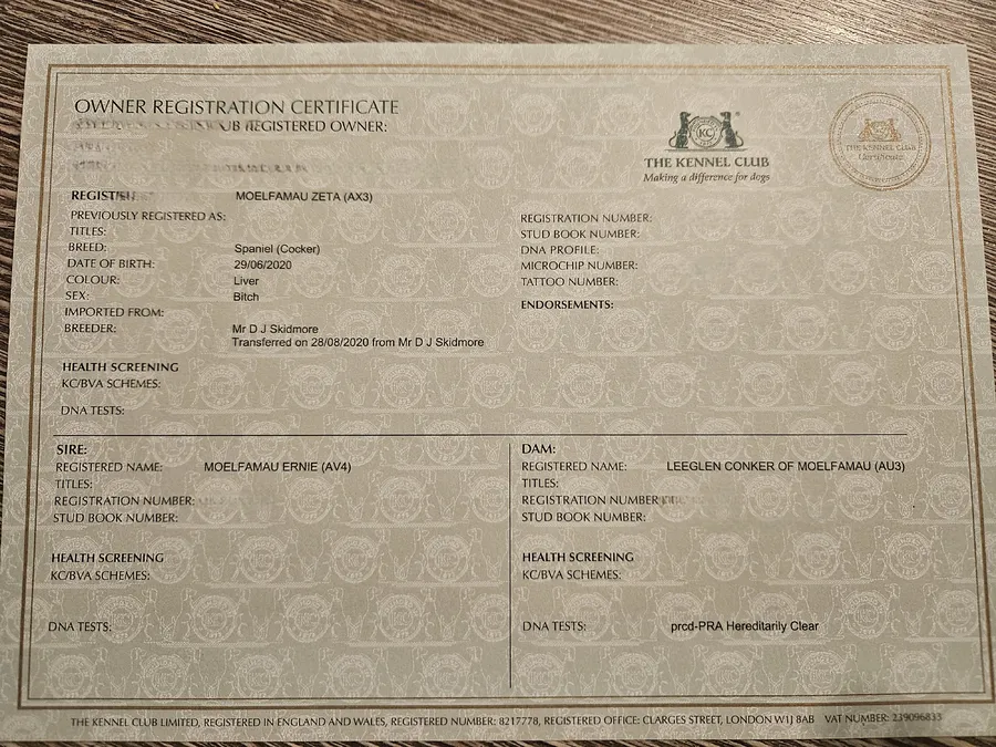 She is fully house trained and kennel trained, comfortable in either environment. Not spayed and never bred from. Pedigree available in photos.