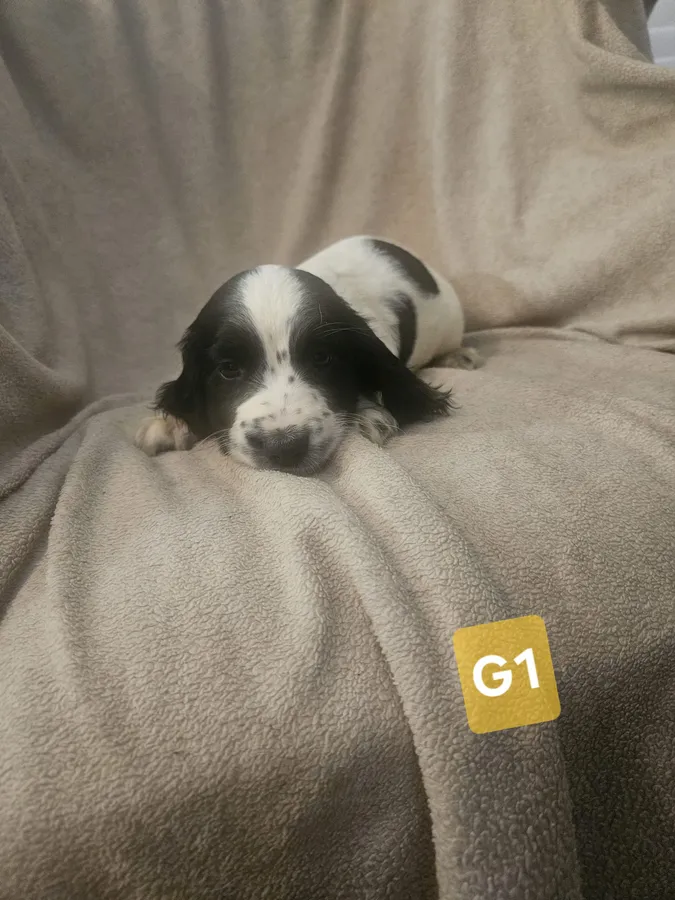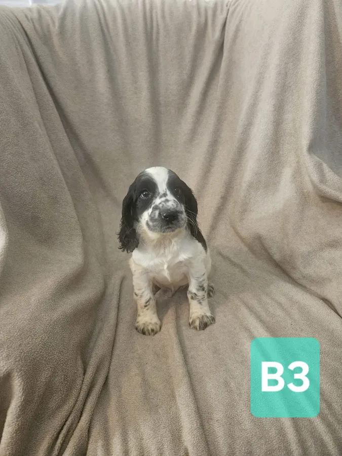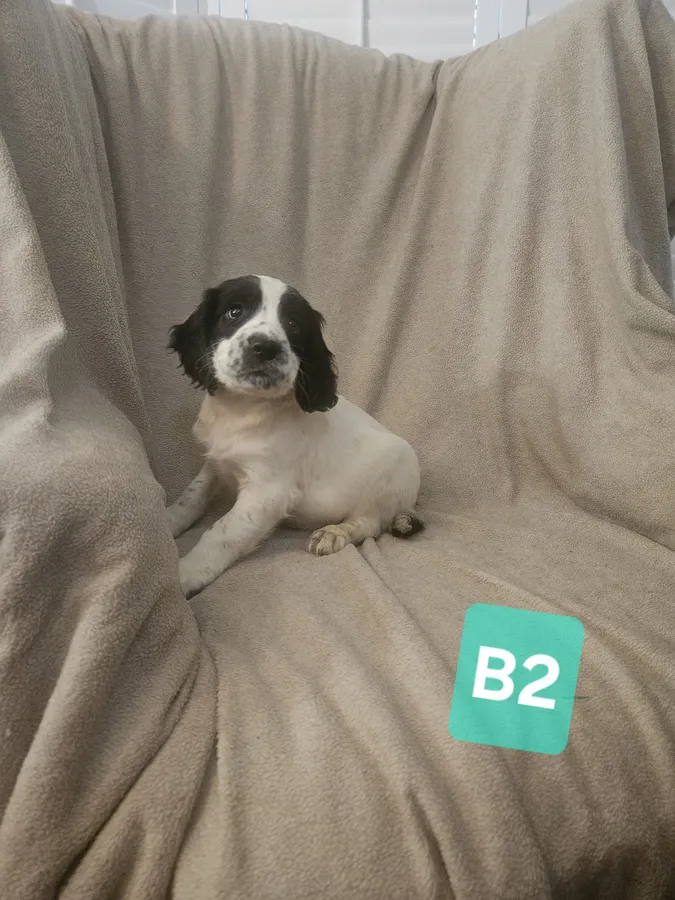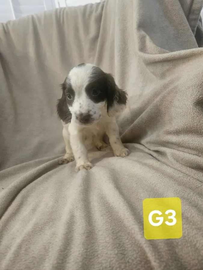sprocker spaniel puppies from working parents. 3 boys 3girls black and white, liver and white. dad is a compact B/W cocker mum is L/W springer spaniel. puppies will be flead wormed and vaccinated ready to leave in a weeks time.