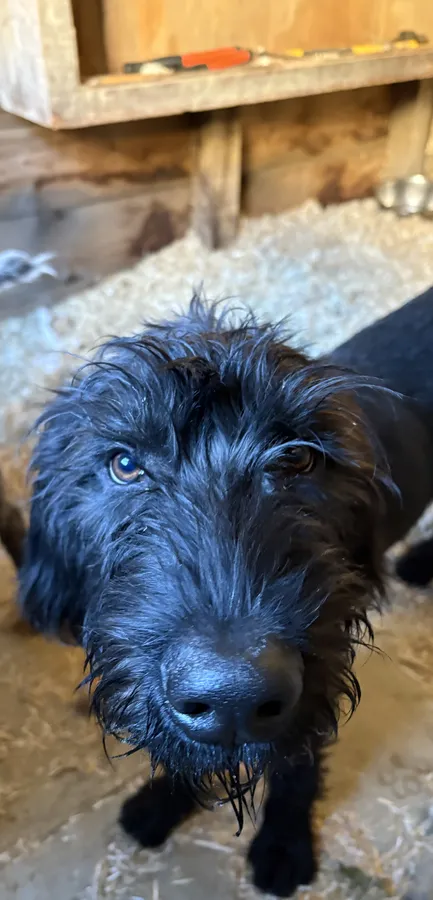 Griffin: 9 months. Black with white chest dog. Intelligent and thoughtful, great nose.
