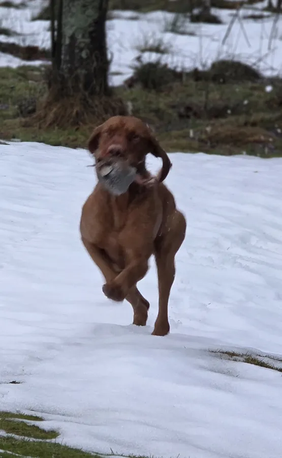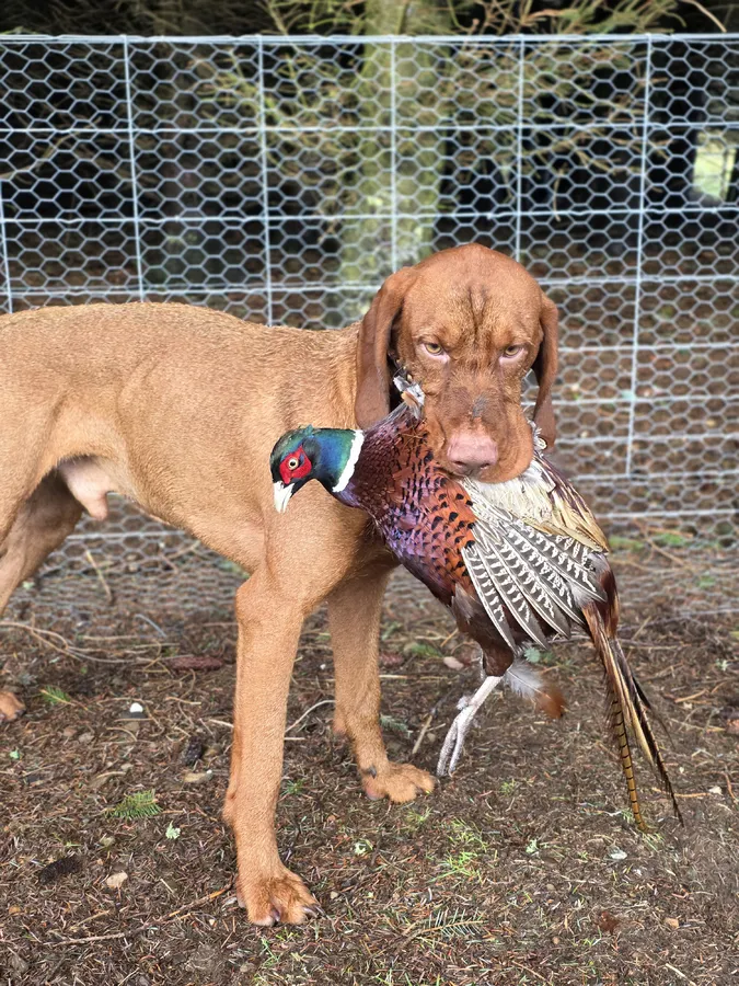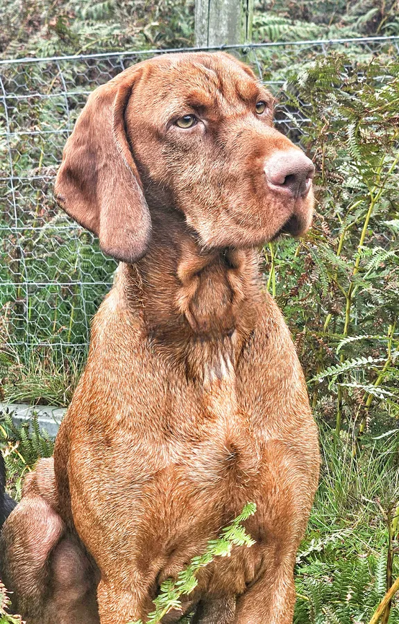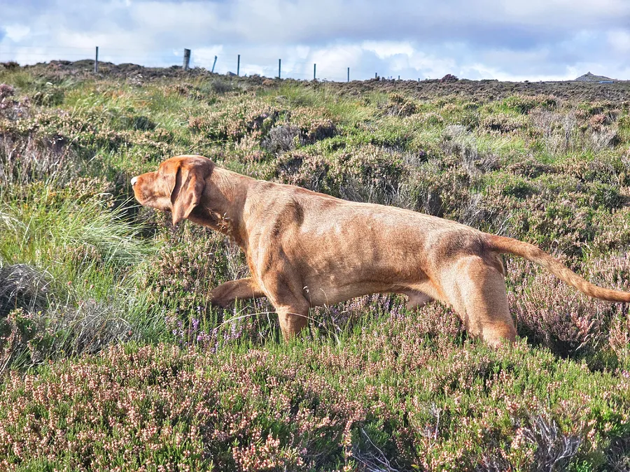 Bert is a genuine working wirehaired vizsla dog with a tight wire coat (will change with age but will remain short ) he is an honest dog in his work both grouse counting and picking up (he's picked up over 60 days this season) , he has a nice gentle delivery and soft mouth. No noise or hassle with him and a genuinely nice dog to train and work, at home he is very easy going with people and other dogs his temperament is superb and he has an off switch workwise and at home.