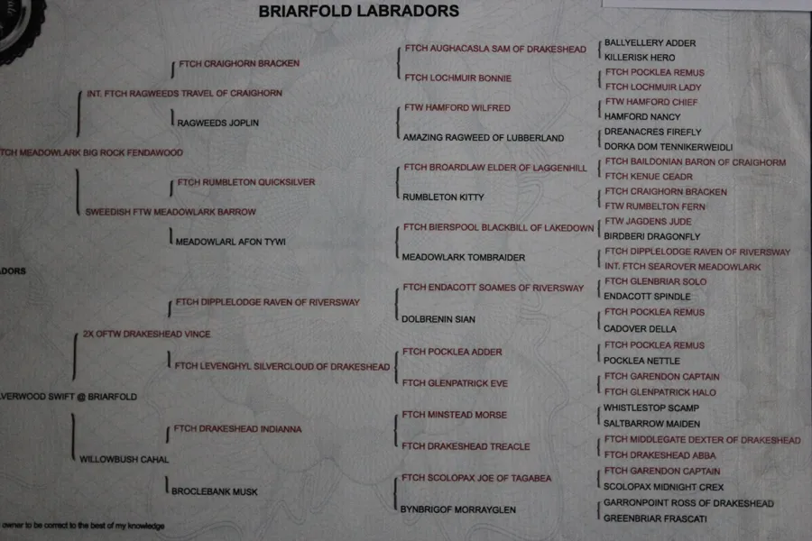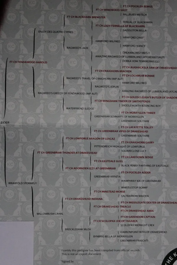 SIRE IS BY FTCH MEADOW LARK BIG ROCK FENDAWOOD, (REGULAR IGL QUALIFIER & ENGLAND TEAM MEMBER) HE HAS HIP SCORES 3/4 AND ELBOW SCORES 0/0, DNA HEREDITARY OF EIC, SD2, CNM, PRCD-PRA, HE HAS 29 FTCH IN HIS 5 GENERATION PEDIGREE,