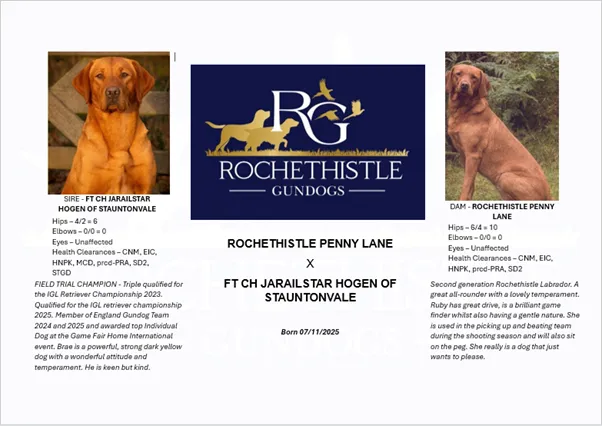 This is a carefully matched, quality litter bred from fully health-tested, proven parents with impeccable working pedigrees — combining natural ability, sound structure, and the exceptional temperament that defines the Labrador.