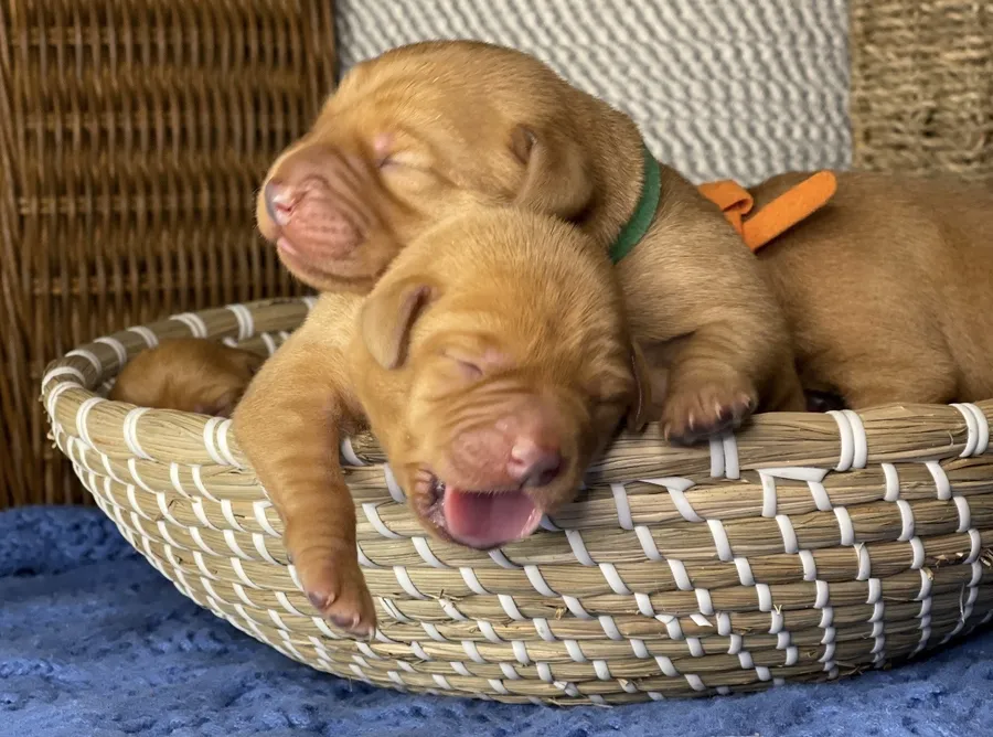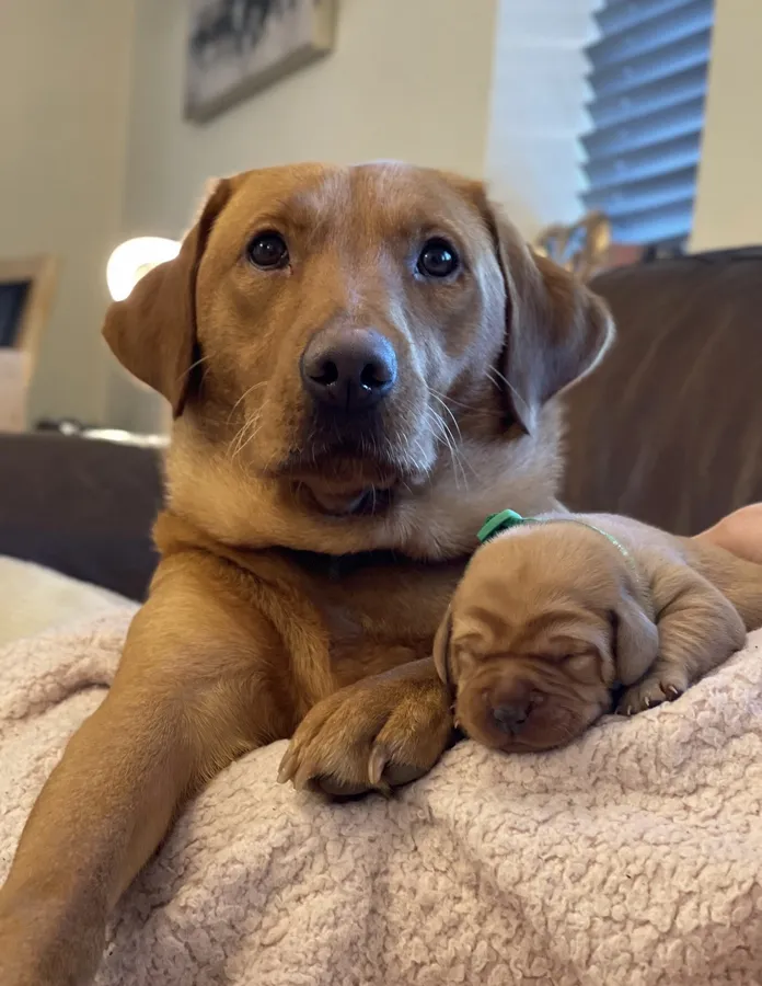 Our gorgeous girl Toffee has welcomed a stunning litter of eight Red Fox Labrador Retriever puppies, born on October 12th – four boys and four girls. All puppies are thriving, and Toffee is proving once again to be an exceptional and devoted mum. Both parents are KC registered Yellow Labradors, with Toffee fully DNA-tested for health and genetic conditions. This is her second litter with the same carefully chosen stud, and just like the first, these puppies are healthy, confident, and full of character. Raised in our family home and around young children, the puppies are used to everyday household sounds and the hustle and bustle of family life. They are handled daily, ensuring they grow up well-socialised and ready to join loving new homes. Before leaving for their new adventures, each puppy will be: