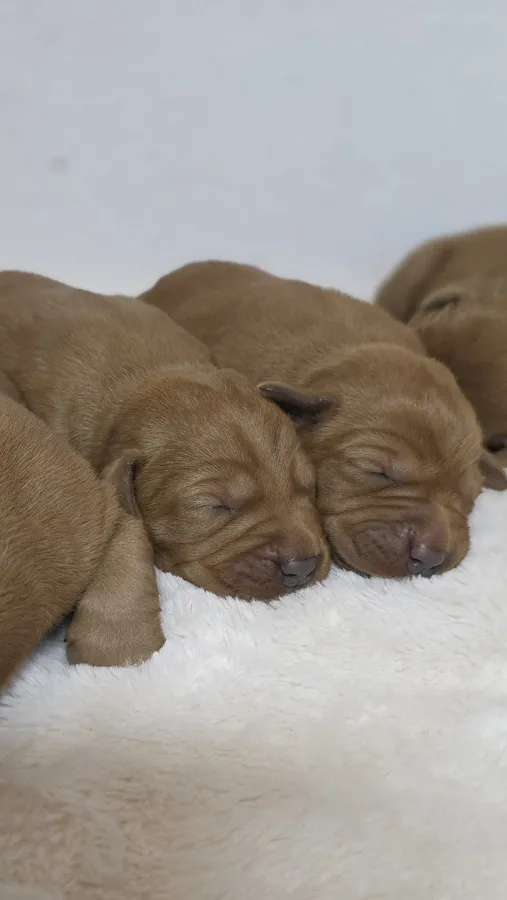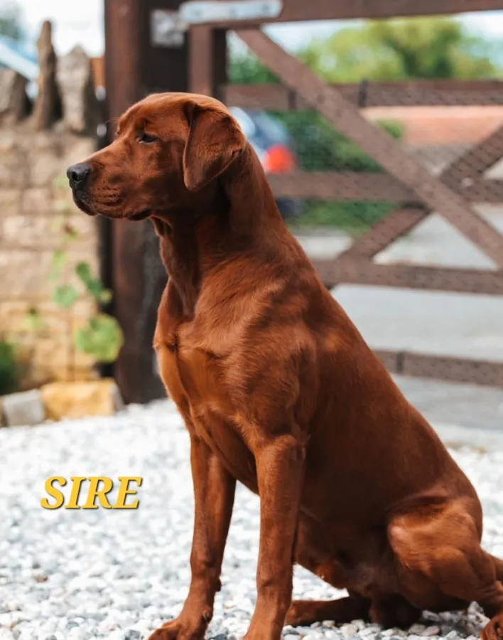 The sire to the puppies is Icon (KC Registered: Aglabs in your honour). Icon is a truly exceptional mahogany red working gun dog and family pet. Bred from American bloodlines for his working ability and deep mahogany colour. He has a large sized, athletic build and has been fully health tested. His hip score is 4/3 (excellent) and a elbow score of 0. He has been DNA tested for all of the Kennel Club recommended tests and much more for which he is clear. He has also been eye tested clear with his latest test being September 2025. Icon has the added bonus of being completely unrelated to Riley over 32 generations, which means the puppies will have a COI of 0.0%.
