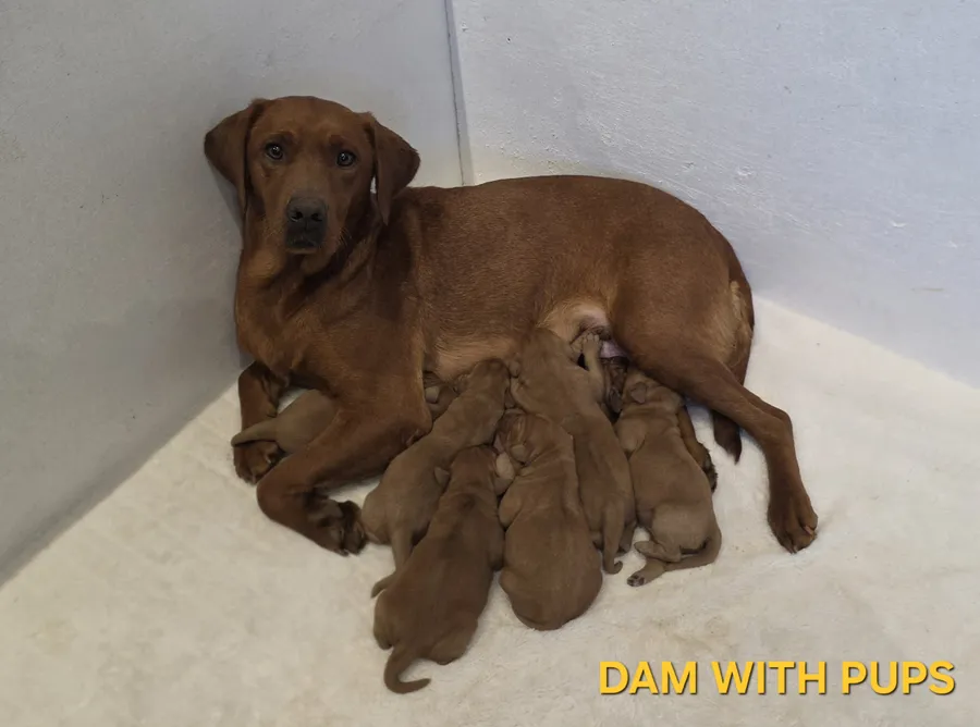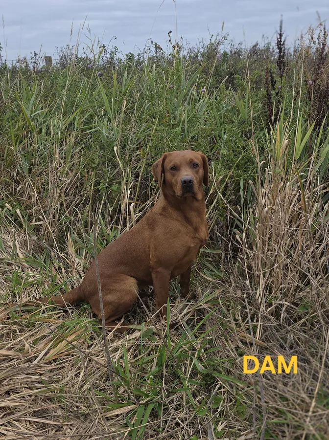 The dam Riley (KC Registered: "Moleshine Pyrite") is a compact, working build fox red labrador with a wonderful temperment. She resides as our pet and working gun dog; working throughout the season on our family shoot. She has a hip score of 4/3 and a elbow score of 0; her eyes have been tested clear for any hereditary diseases with her latest test being June 2025. Riley has also been extensivley DNA tested for 255 defects for which she is clear for every one (including all 7 kennel club recommended tests).