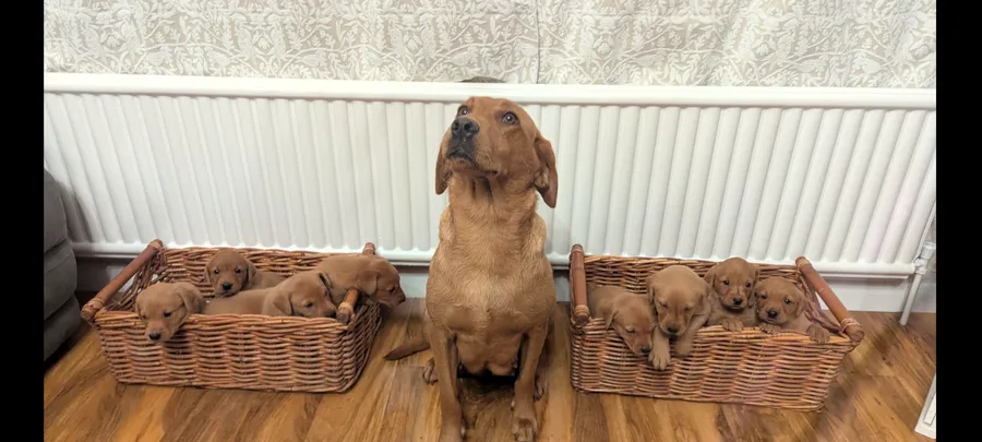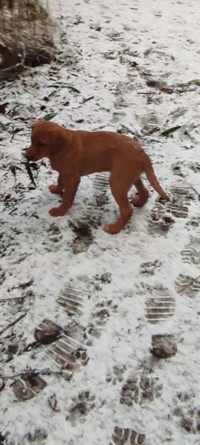 We are delighted to have a very healthy litter of 8 pups (5 girls & 3 male) 1 girl left photos of her in the snow . They are up to day with vaccine and microchipped. They are KC Registered. The mother is MALLARDBANK IRIS my fox red bitch she is a working dog also a part of the family. The sire is BLACKSYKES ETERNITY a stunning dark foxed strong working dog. He has been in shooting magazines. The pups will make very good working dogs also active homes, there will be a 5 weeks free insurance come with each pup