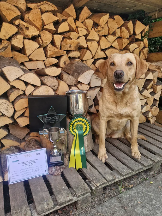 Dam is sired by FT CH Beileys Aguzannis of Fendawood and her grand sire is FT CH Mitforton Oscar of Leadburn. She competes in working tests, won at novice level June 2025 and won the Rising Star award at Scone Game Fair 2025. She picks up throughout the season and will trial later this year. She is a fantastic working dog, happy in the kennel or house and the litter was planned to give us a couple of puppies to add to our team.