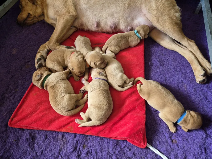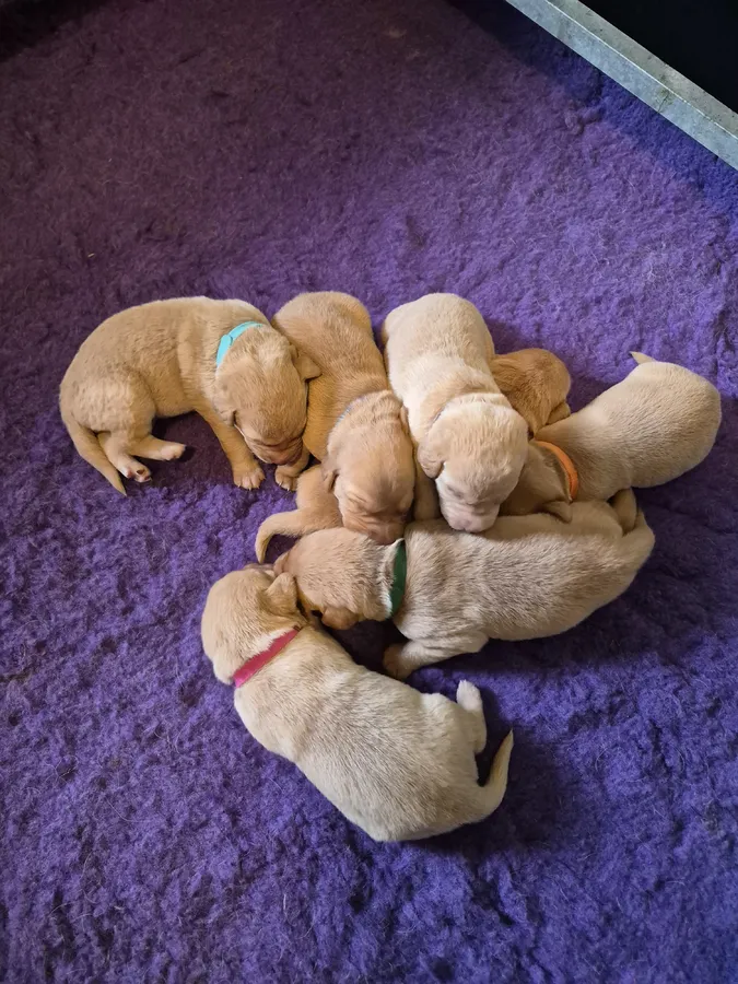 The puppies are being raised in the house and exposed to usual household noises, young children etc and are having ENS and ESI stimulation exercises during their early weeks. They will be microchipped, vet checked and KC registered, ready for new homes from 30th April . Puppies will make excellent working dogs, very active pet homes will be considered too. 3 yellow dog pups available.