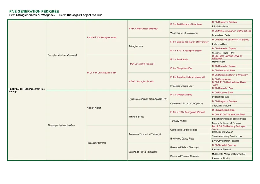 Mother is THALASGAIR LADY OF THE GUN. Hips 2/1 elbows 0/0. BVA clear. Genetically clear of all diseases, CNM, HNPK, PRA, EIC,SD2, STGD, MCD.
