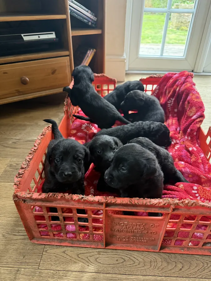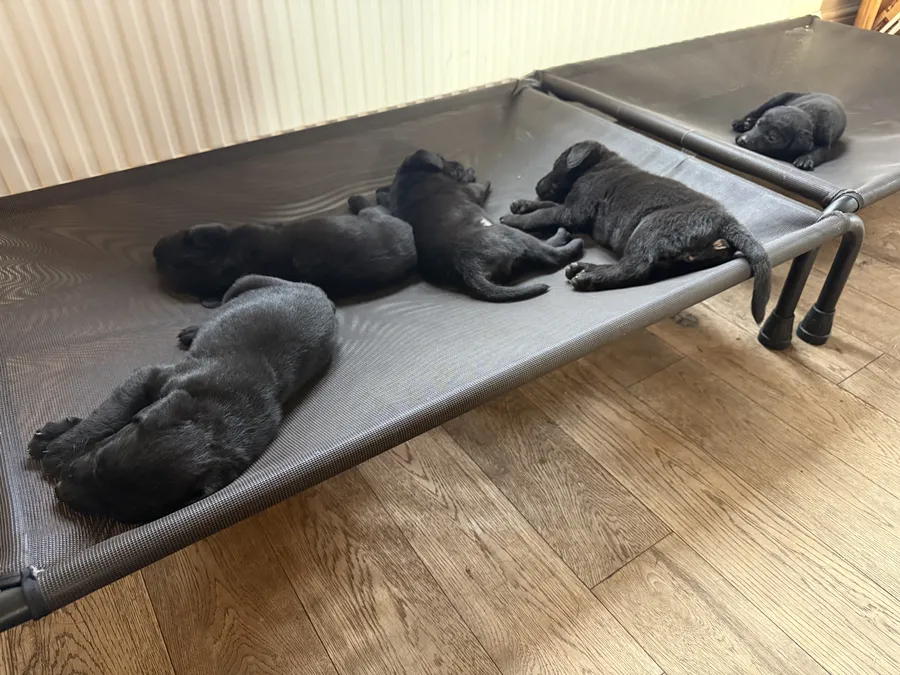 Litter of eight black Labrador Retrievers (3 dogs, 5 bitches), born 28th February 2026. Ready to leave end of April / first week of May.