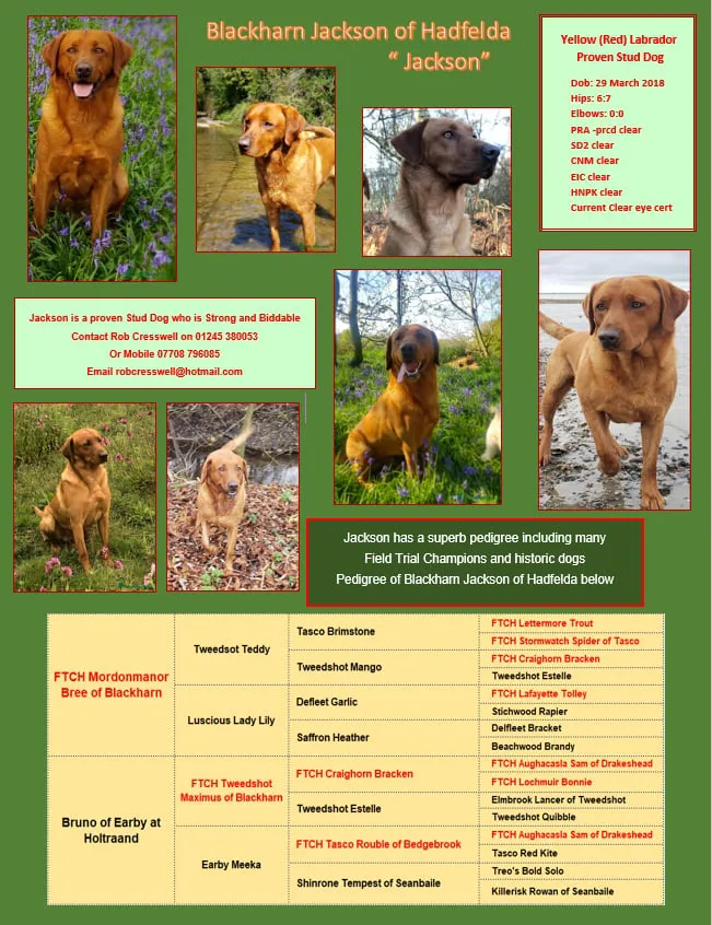 r HNPK Clear SD2 Clear CNM Clear PRA Clear Dam FTCh Mordonmanor Bree Of Blackharn Working blood lines – 21 Field Trial Champions in pedigree including FTCh Pocklea Remus, FTCh Layfayette Tolley, FTCh Craighorn Bracken, FTCh Tweedshot Maximus Of Blackharn Proven Stud Dog – strong and biddable Contact Rob Cresswell on 01245 380 053, Mobile 07708 796 085, or Email robcresswell@hotmail.com