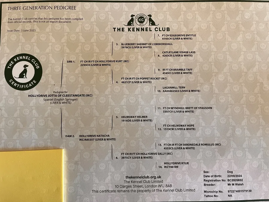 Micky is 12 months old, with a fantastic pedigree. Son of FTCH Hollydrive Kurt, and on the Bitch line, Grandson of FTCH Hollydrive Sally.