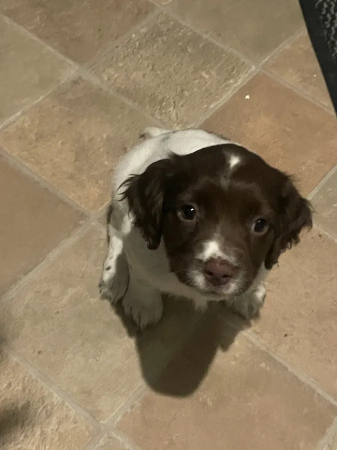 She is already happy to carry and has the start of a retrieve, showing natural hunting ability, nose and tail down. Lovely eye contact, pretty face and biddable nature.