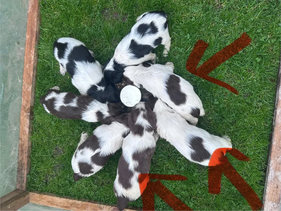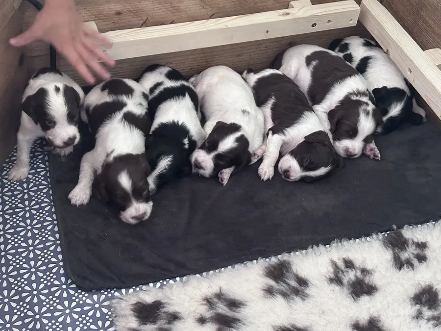 We have had 5 boys and 2 girls in this litter. One black and white boy and one black and white girl and the rest liver and white.