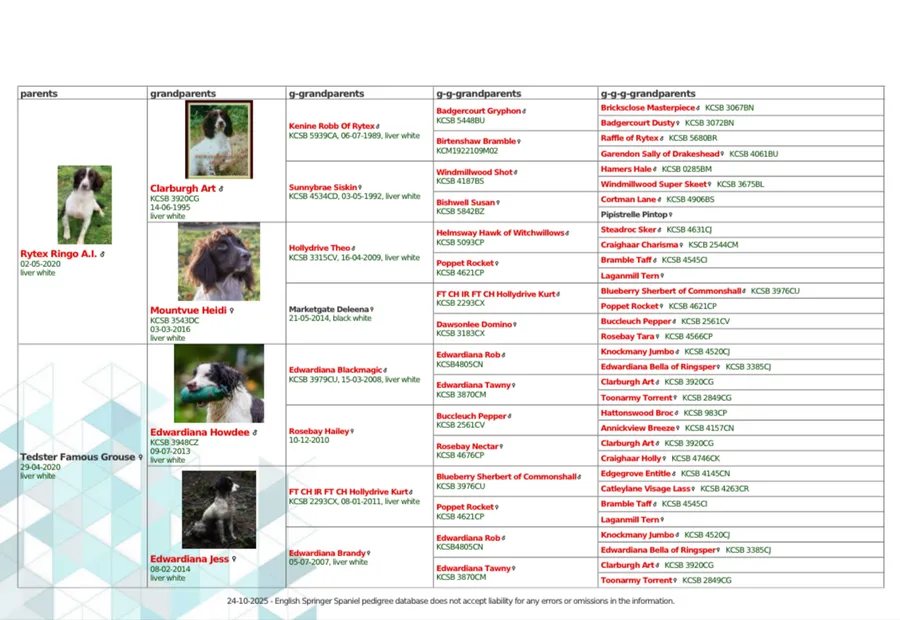 Sired by FTCH Rytex Ringo whom is not only renowned himself but, sired the 24/25 springer championship winner amongst many other exceptional offspring. Out of an Edwardiana bred bitch who is a top class working dog and sired by the OFTW Edwardiana Howdee and out of FTW Edwardiana Jess.