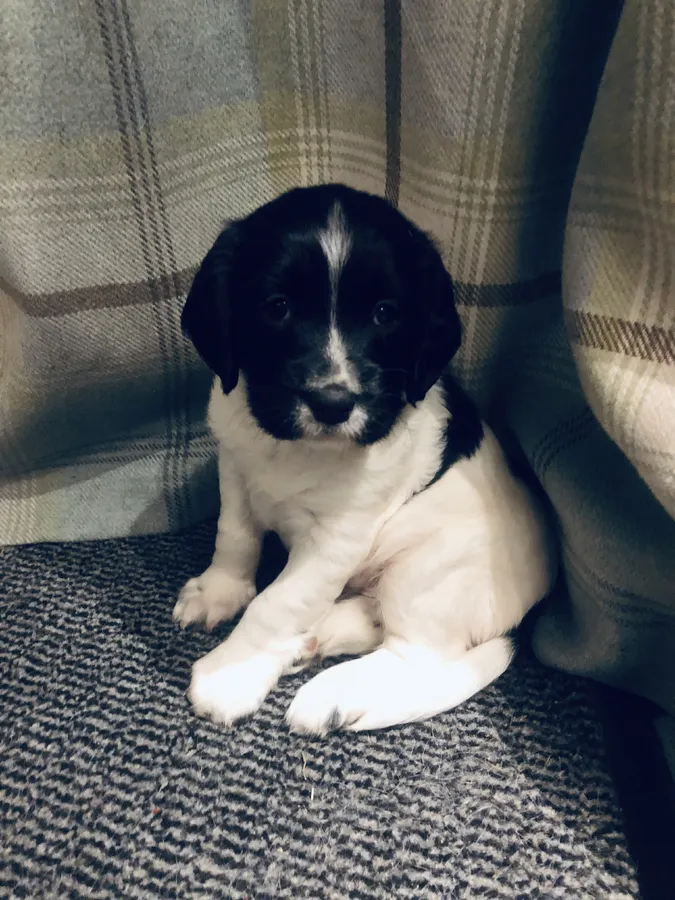 We have one very big, heathy B&W ESS bitch puppy available. This puppy is the fourth generation I have bred and continues the Bramblefrost line. She is already proving to have a fantastic temperament and strong frame. She is confident, inquisitive, and playful. Her KC registration has already been granted and she will leave here with the correct kennel club documentation. Please note we have chosen NOT to have her tail docked. She will be microchipped before leaving for her forever home.
