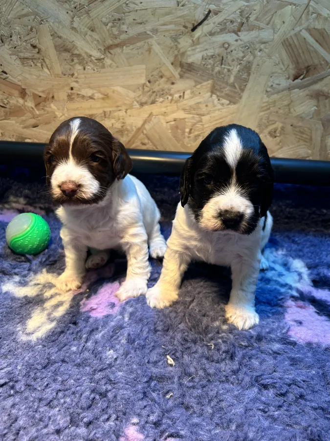 Two gorgeous, chunky very well bred working springer spaniel puppies. 1 black & white dog 1 liver & white bitch both with lovely markings.