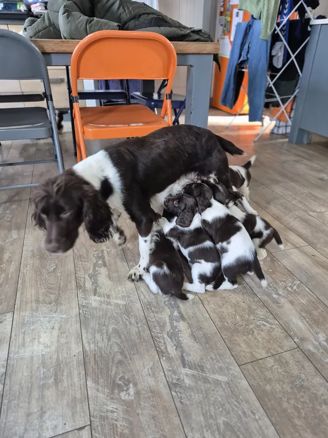 Our stunning litter of Springer pups are being raised in a busy family environment and are well handled daily — confident, affectionate and full of character.
