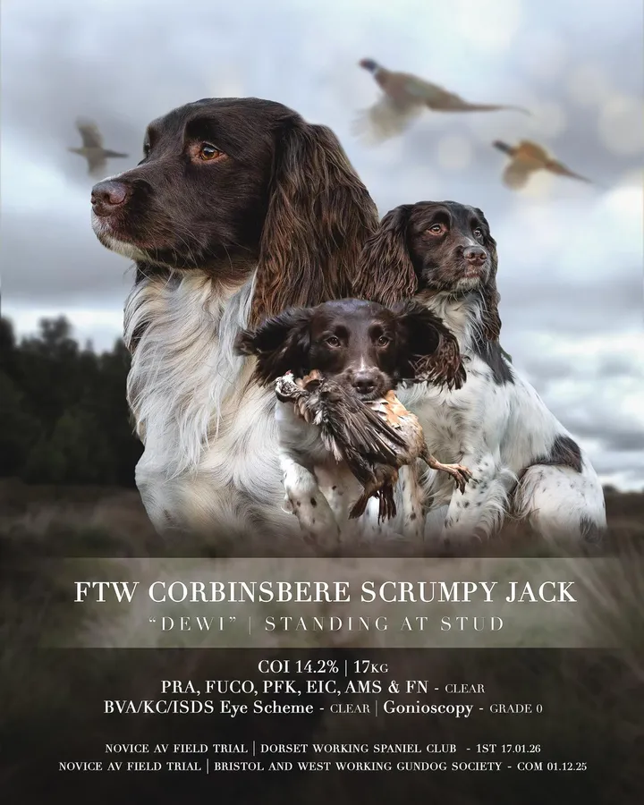 Dewi has all the attributes we love in a spaniel, kind quiet temperament, good game finding ability, heâs solid out working with natural drive, silent and a good mouth. Competent in all disciplines, trialling, on peg, picking up, beating and rough shooting.