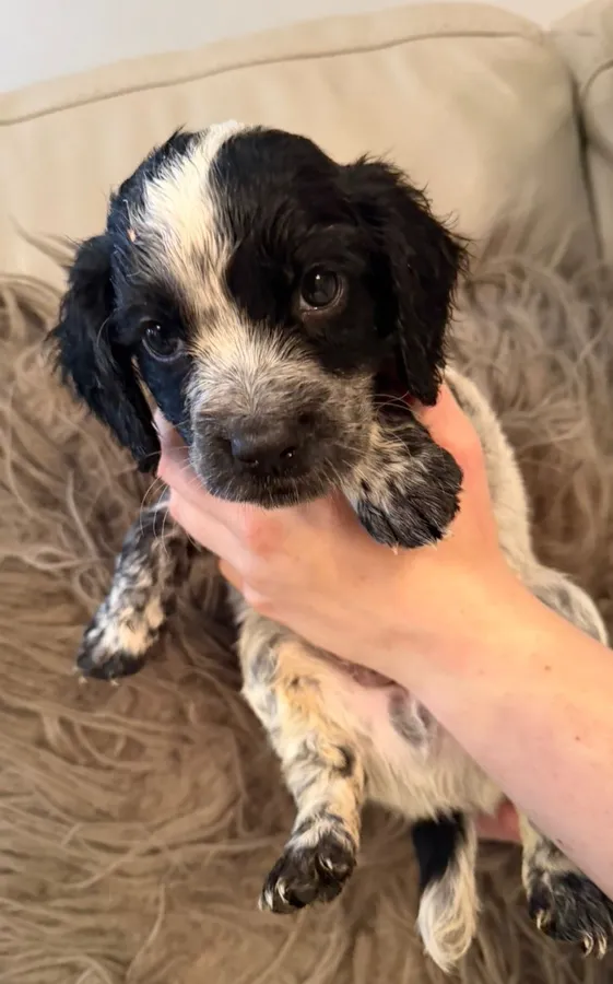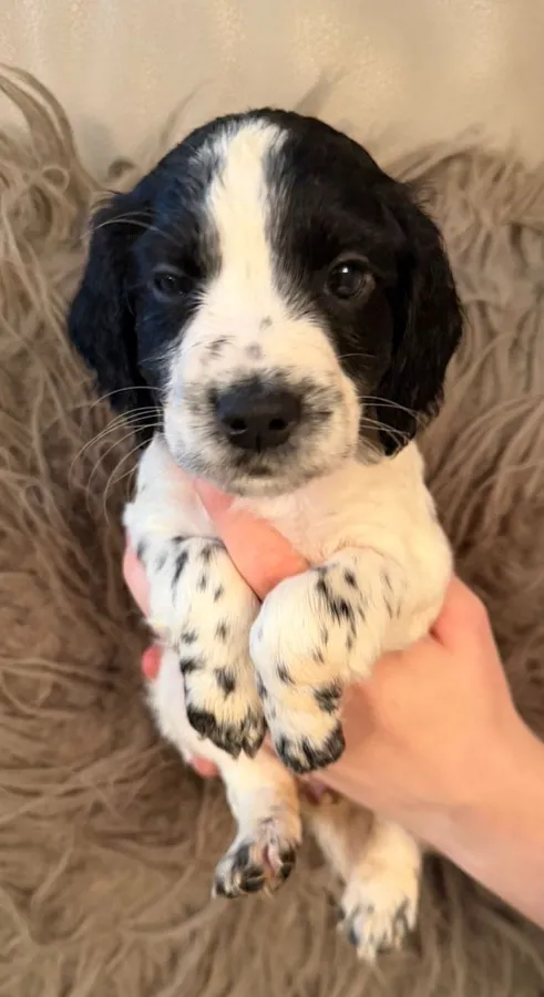 Mum can be seen, mum is Popperby Bonnie (Kiara) is a beautiful black and white girl she’s a nice petite spaniel. dad is a beautiful blue Roan Wrayven Moss Star (Noe) health tested for PRA, AMS, FN, PP, BVA, and GONIO grade 0, he is a hard working dog and works on a family shoot flushing out and picking up , he also works in a line in a local shoot , he will work hard ground and has a love for water , he is eager too please whatever is asked of him