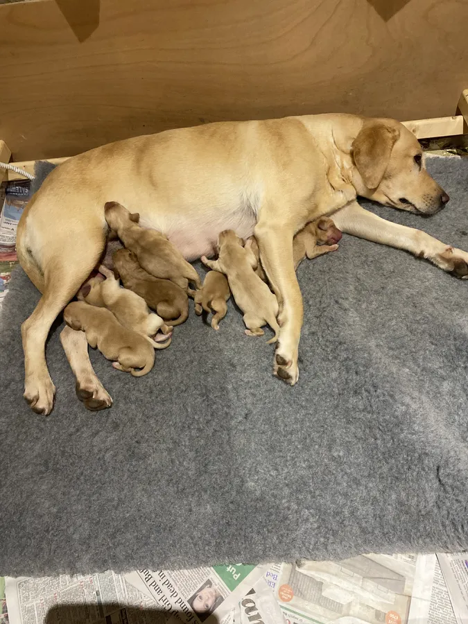 Yellow / dark yellow litter of 7 born 28th Sept , at Woodruff. This is a repeat mating  of Tottie x Trevor from last year after such a successful pairing. Just 2 dogs available. I own mum & dad , daughter from a previous Tottie litter & a granddaughter so you meet the whole family.