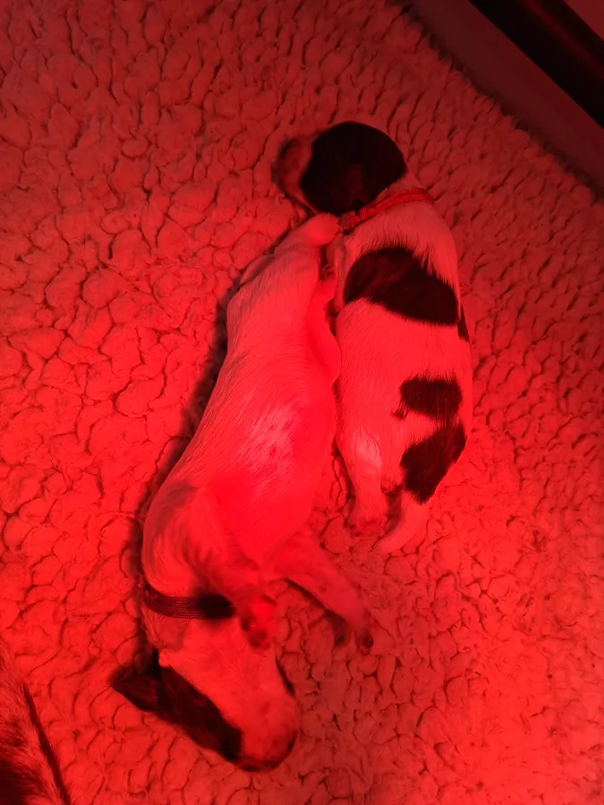 Heidi has had a litter of 6 lier and white coloured puppies. These puppies will be brought up in a family environment with a mixture of indoor and outdoor time. They are brought up around children and other dogs/animals and will have had lots of introductions and experiences in the 8 short weeks they are with us including socialisation with noises, texture and levels, basic training, toilet training, crate and car training and forming a sleeping pattern.