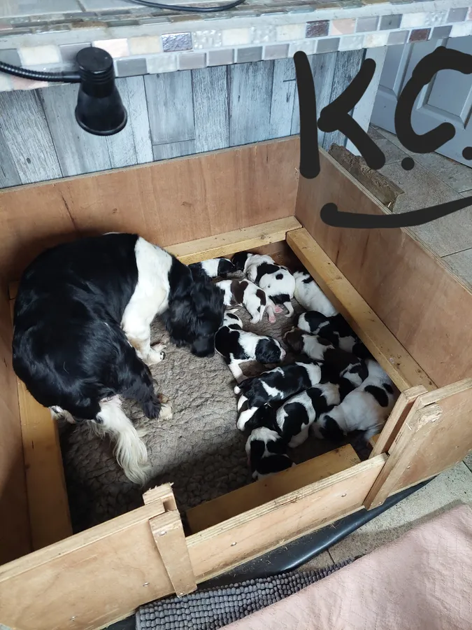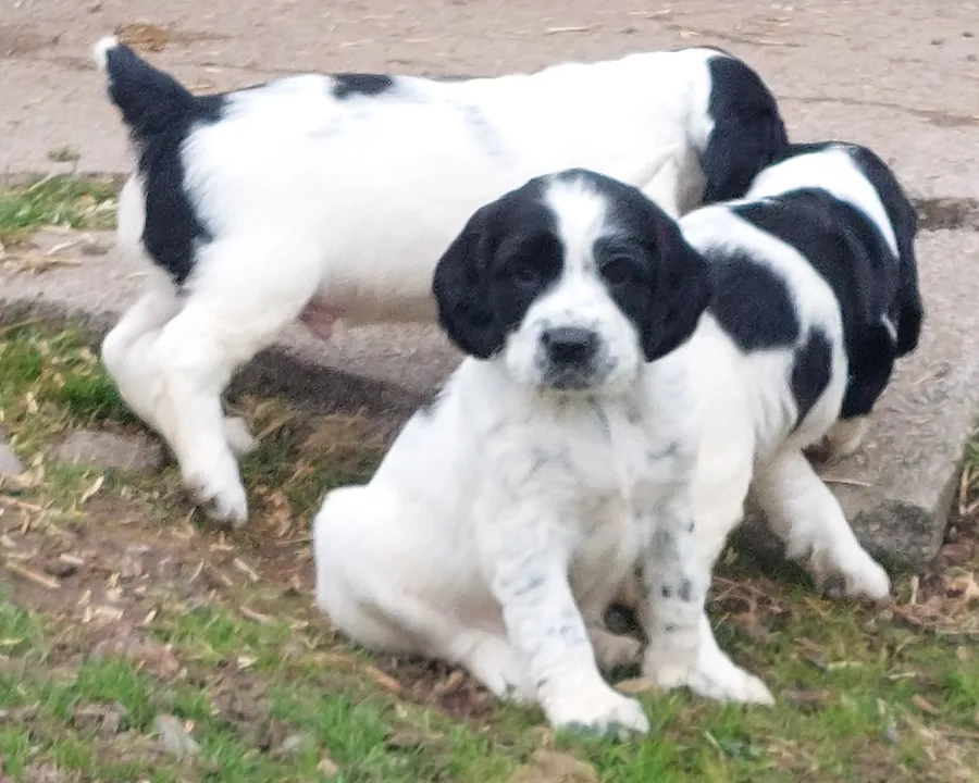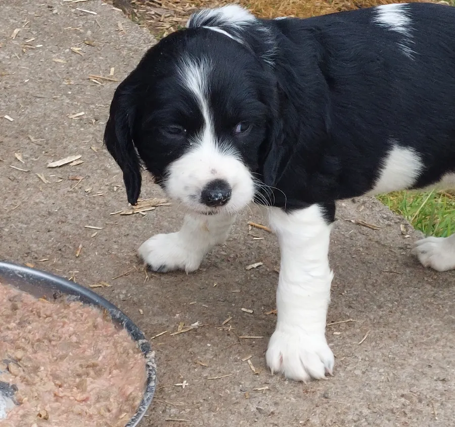 Here we have available males and females,liver and white and black and white to go to good family homes.Some pups are already booked,a deposit secures when you choose your puppy. Ready to leave from Nov 6th. Mum Elfie is here and dad Finn is only a mile away. Elvie is a small black and white,Finn is the liver and white. Both parents have excellent working pedigrees and temperament of both are solid and friendly.. Pups and mum have been health checked at home by our vet,Two Rivers of Biggar and are chipped and had first vaccination. Pups are KC registered with Elvis song titles being the theme for this litter. Pups are wormed to date with Panacur at 3 and 5 weeks and will be done again every 2 weeks until.11 weeks old. Flea and tick treatment with fipronil done at 6 weeks too. Pups are very well socialised with the other spaniels and big dogs,they love listening to Greatest Hits Radio or their Sound Sociable CD. All puppies and mum fed on Beta puppy and tinned loaf meat They also love evaporated milk and creamed rice and let's not forget their tuna and sardines! Pups come with food pack,toy,KC 5 generation pedigree,registration paperwork,puppy advice pack and puppy agreement. Genuine visitors only wanted,no photo collectors please,and no ody just out for a jolly day to cuddle the pups. All visitors are advised that we run cctv cameras around property. We are and have been top quality licensed breeders with South Lanarkshire Council for many years now with a successful annual visit each year. We have been with the same vet in Biggar since 2009. References on request.