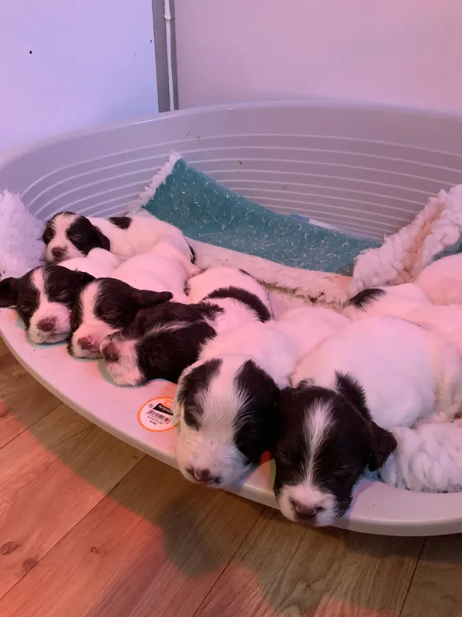 Lovely litter of springer puppies. Bred from our working dogs. Mum and Dad are both intelligent and hard-working dogs. Really good on open ground and in cover. Also retrieve from water. Would suit working or active pet-home. Legally docked. Will be microchipped, first vaccination and health checked. Both Parents have been DNA tested.