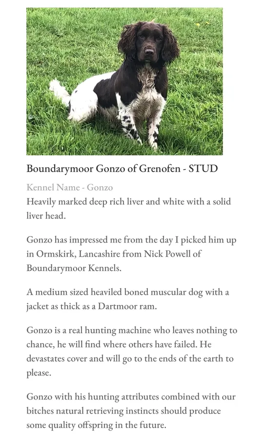 Dam: Exceptional working Gundog, biddable and keen, with excellent game-finding instinct.